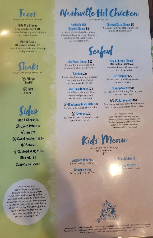 Welcome to Shipwreck Bar & Grill, a family-run gem inspired by the sun-soaked shores of Clearwater Beach, Florida. Our from-scratch kitchen delights guests with a diverse menu featuring mouthwatering seafood, hearty sandwiches, succulent steaks, fresh salads, and the iconic Nashville Hot Chicken. Whether you're dining in our welcoming outdoor space or enjoying takeout, we cater to everyone—groups, families, and solo diners alike. Join us for lunch, dinner, or drinks amidst a lively atmosphere with great cocktails and a wide selection of beers. Conveniently located with accessible parking, we invite you to make memories at Shipwreck Bar & Grill!